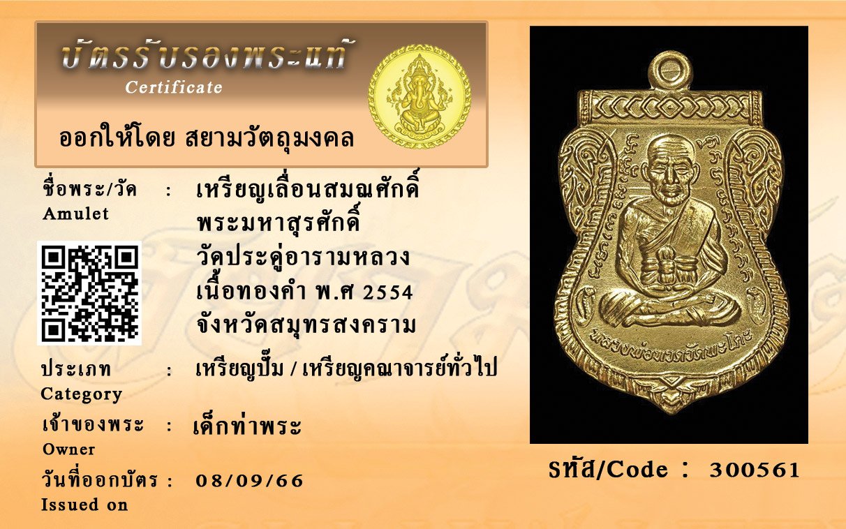 รหัสสินค้า : 300561 เหรียญเลื่อนสมณศักดิ์ พระมหาสุรศักดิ์ วัดประดู่อารามหลวง เนื้อทองคำ พ.ศ 2554 จังหวัดสมุทรสงคราม