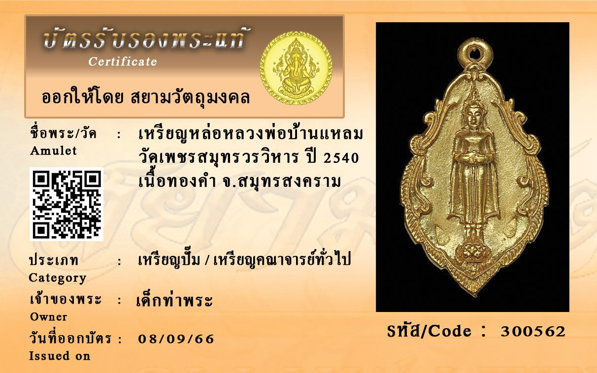 รหัสสินค้า : 300562 เหรียญหล่อหลวงพ่อบ้านแหลม วัดเพชรสมุทรวรวิหาร ปี 2540 เนื้อทองคำ จ.สมุทรสงคราม