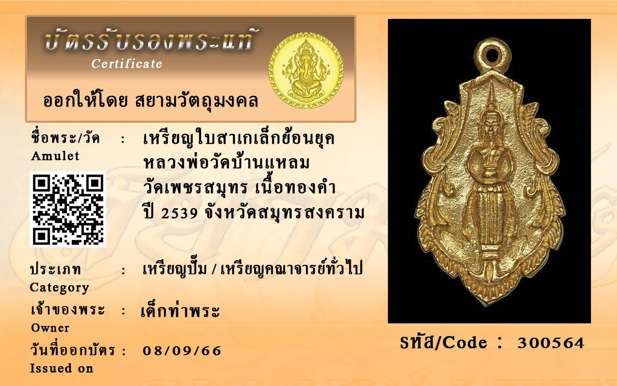 รหัสสินค้า : 300564 เหรียญใบสาเกเล็กย้อนยุค หลวงพ่อวัดบ้านแหลม วัดเพชรสมุทร เนื้อทองคำ ปี 2539 จังหวัดสมุทรสงคราม