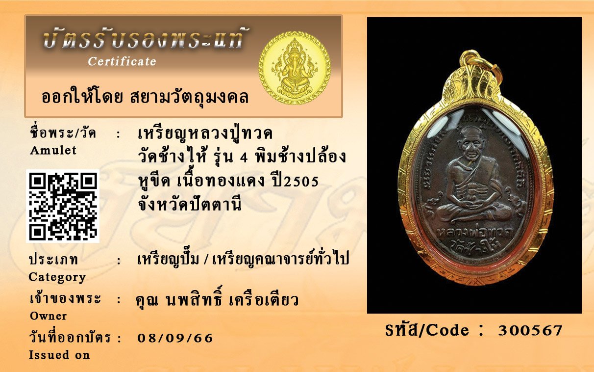 รหัสสินค้า : 300567 เหรียญหลวงปู่ทวด วัดช้างไห้ รุ่น 4 พิมช้างปล้อง หูขีด เนื้อทองแดง ปี2505 จังหวัดปัตตานี