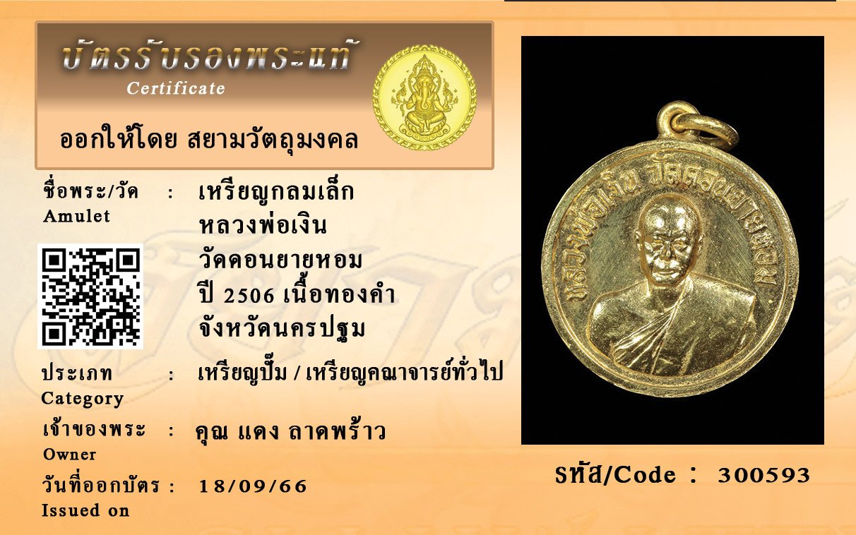 รหัสสินค้า : 300593 เหรียญ กลมเล็ก หลวงพ่อเงิน วัดดอนยายหอม ปี 2506 เนื้อทองคำ จังหวัดนครปฐม