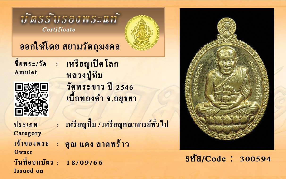 รหัสสินค้า : 300594 เหรียญเปิดโลก หลวงปู่ทิม วัดพระขาว ปี 2546 เนื้อทองคำ จ.อยุธยา