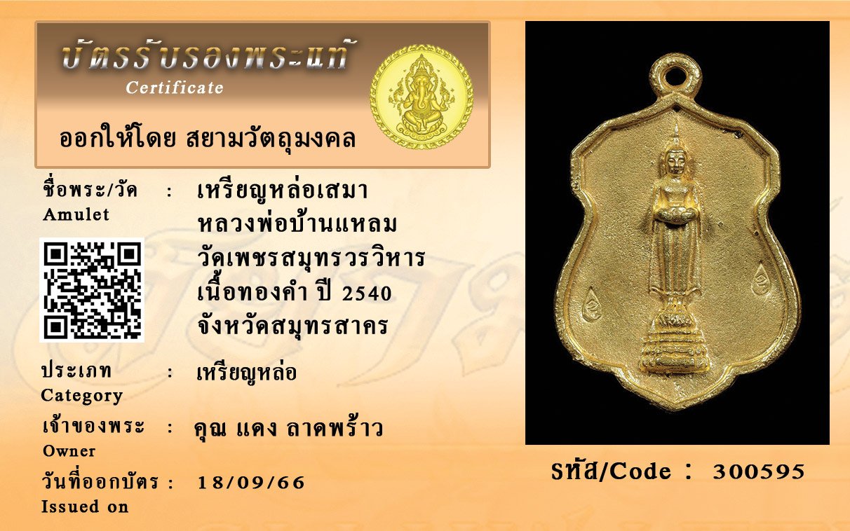 รหัสสินค้า : 300595 เหรียญหล่อเสมา หลวงพ่อบ้านแหลม วัดเพชรสมุทรวรวิหาร เนื้อทองคำ ปี 2540 จังหวัดสมุทรสาคร