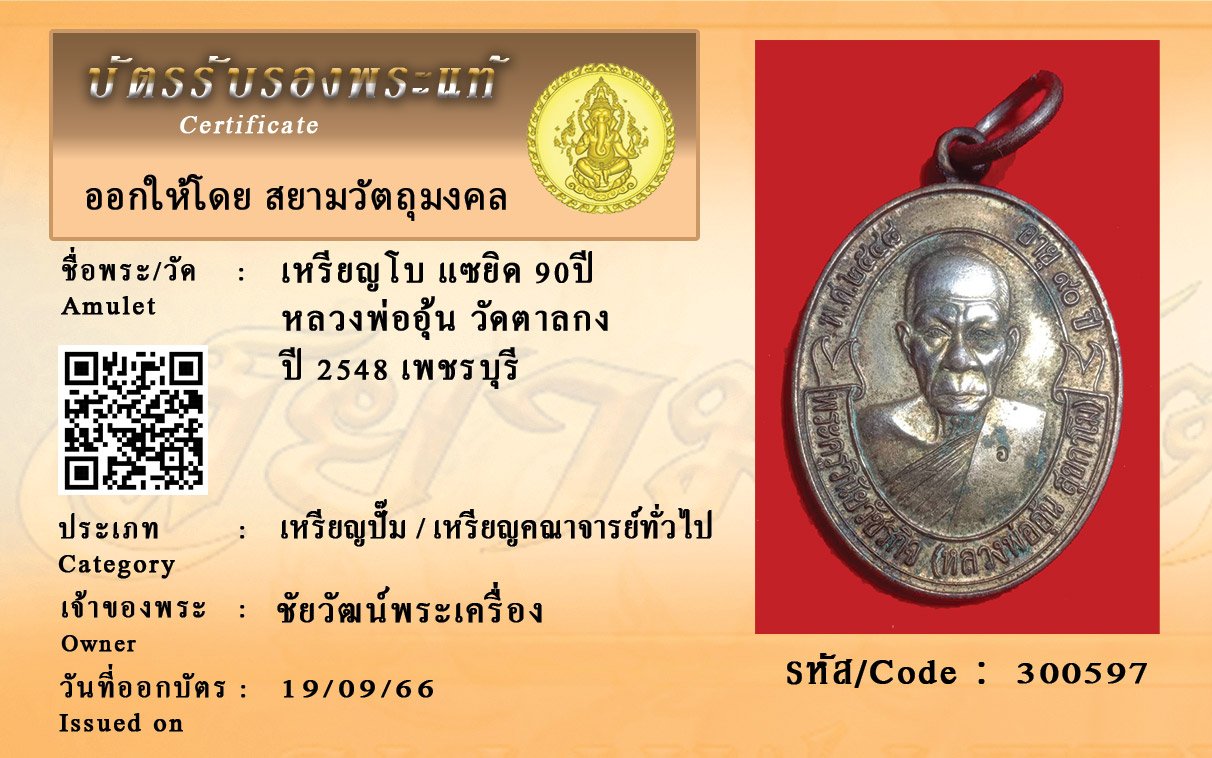 รหัสสินค้า : 300597 เหรียญโบ แซยิด 90ปี หลวงพ่ออุ้น วัดตาลกง ปี 2548 เพชรบุรี