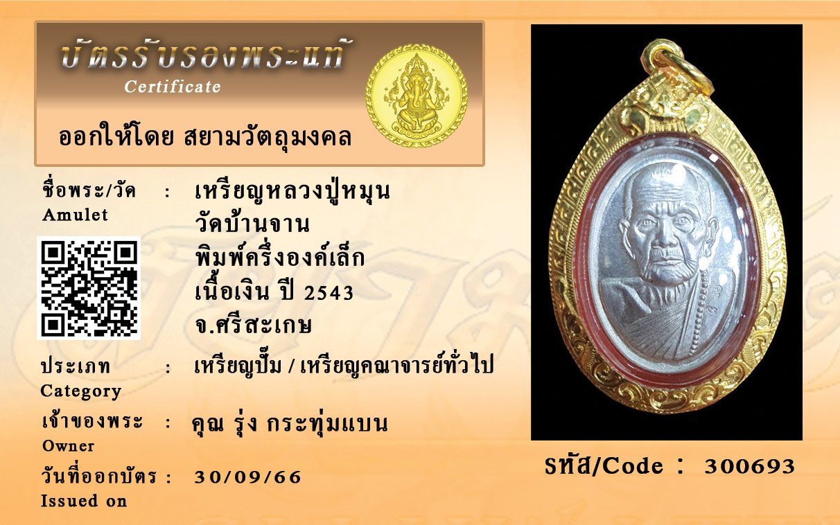 รหัสสินค้า : 300693 เหรียญหลวงปู่หมุน วัดบ้านจาน พิมพ์ครึ่งองค์เล็ก เนื้อเงิน ปี 2543 จ.ศรีสะเกษ