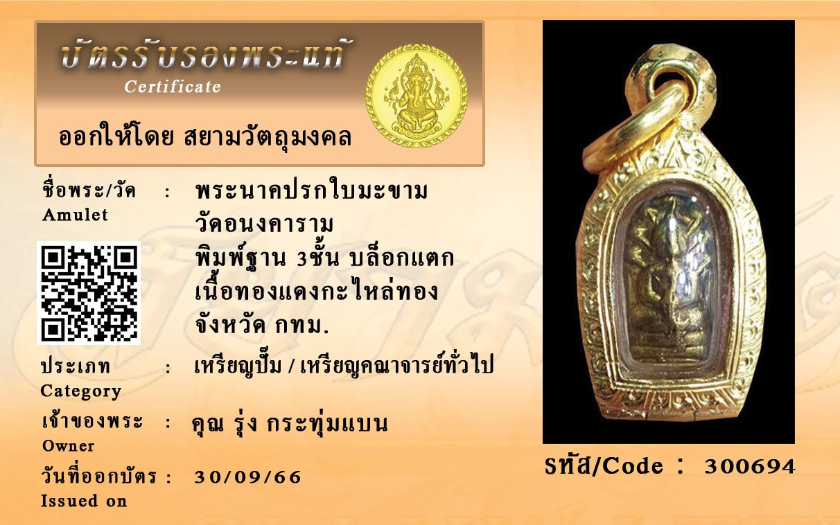 รหัสสินค้า : 300694 พระนาคปรกใบมะขาม วัดอนงคาราม พิมพ์ฐาน 3ชั้น บล็อกแตก เนื้อทองแดงกะไหล่ทอง จังหวัด กทม.