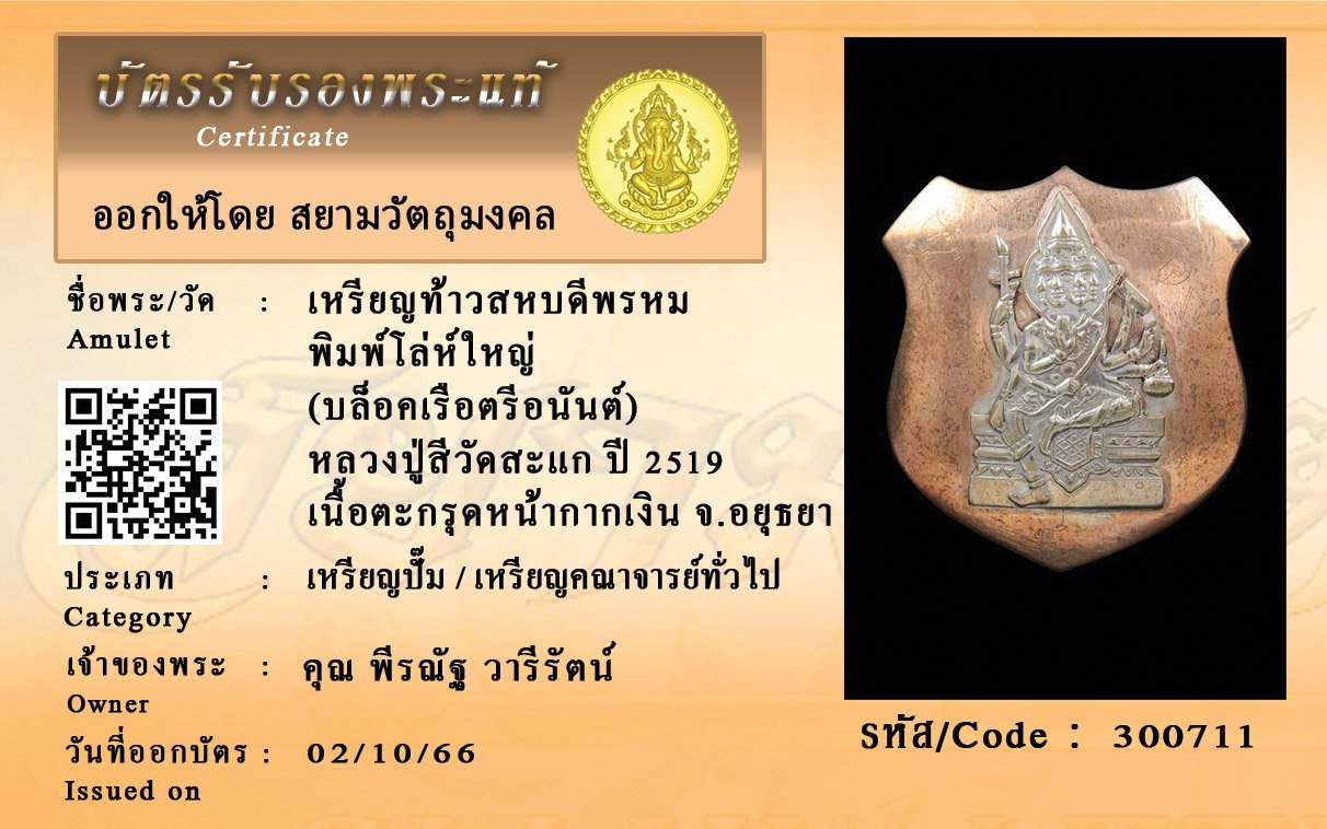 รหัสสินค้า : 300711 เหรียญท้าวสหบดีพรหม พิมพ์โล่ห์ใหญ่ (บล็อคเรือตรีอนันต์) หลวงปู่สีวัดสะแก ปี 2519 เนื้อตะกรุดหน้ากากเงิน จ.อยุธยา