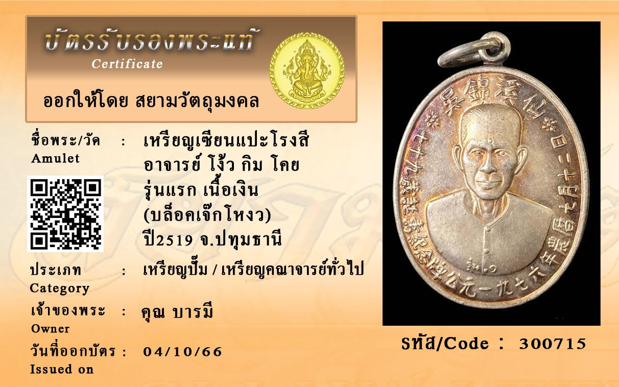 รหัสสินค้า : 300715 เหรียญเซียนแปะโรงสี อาจารย์ โง้ว กิม โคย รุ่นแรก เนื้อเงิน (บล็อคเจ๊กโหงว) ปี2519 จ.ปทุมธานี