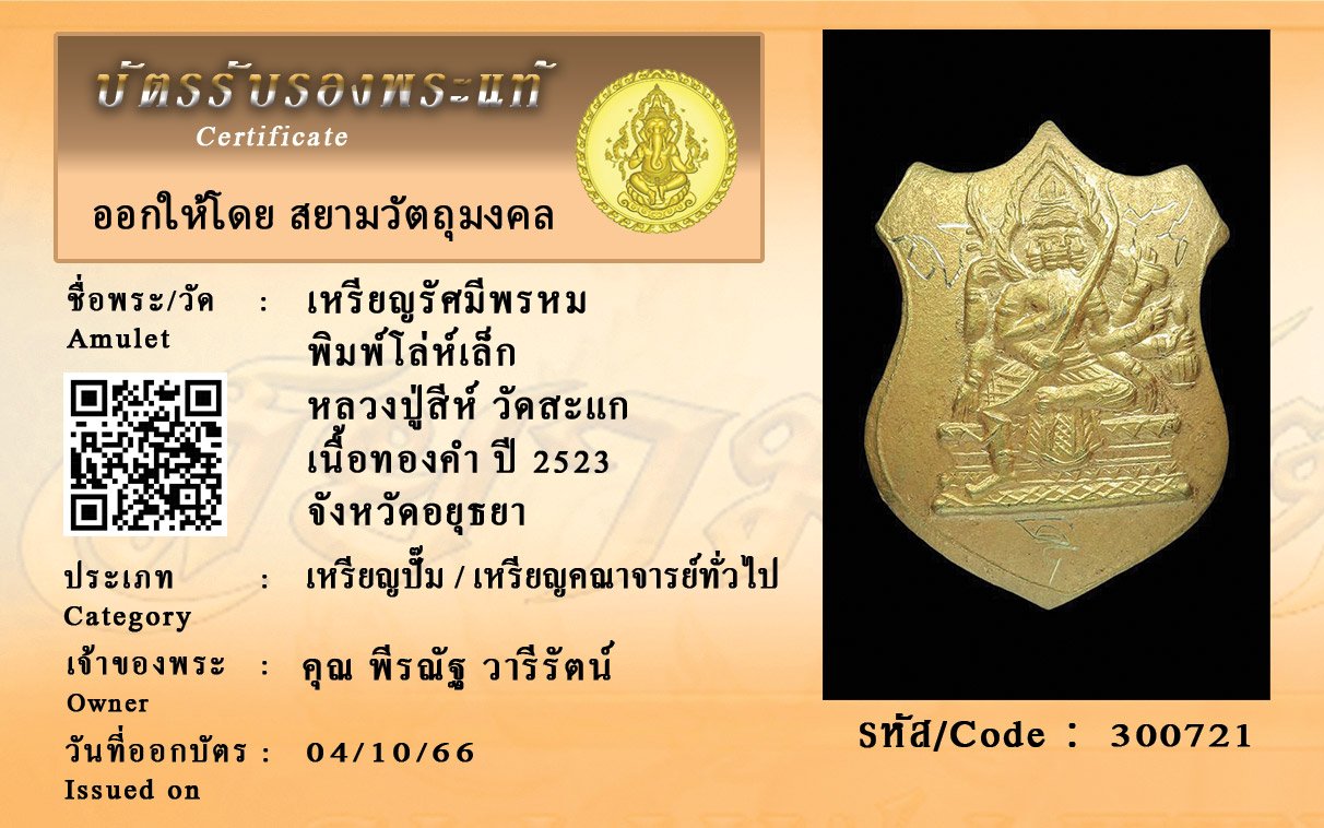 รหัสสินค้า : 300721 เหรียญรัศมีพรหม พิมพ์โล่ห์เล็ก หลวงปู่สีห์ วัดสะแก เนื้อทองคำ ปี 2523 จังหวัดอยุธยา