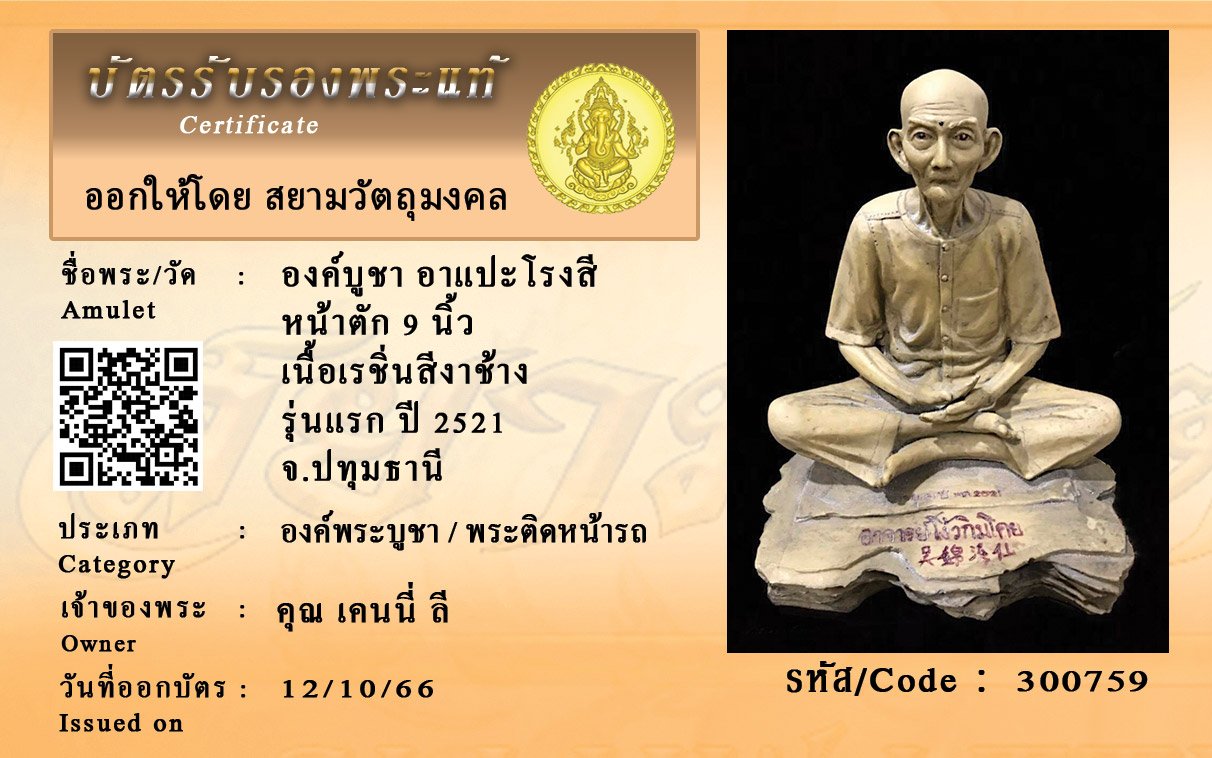 รหัสสินค้า : 300759 องค์บูชา อาแปะโรงสี หน้าตัก 9 นิ้ว เนื้อเรชิ่นสีงาช้าง รุ่นแรก ปี 2521 จ.ปทุมธานี