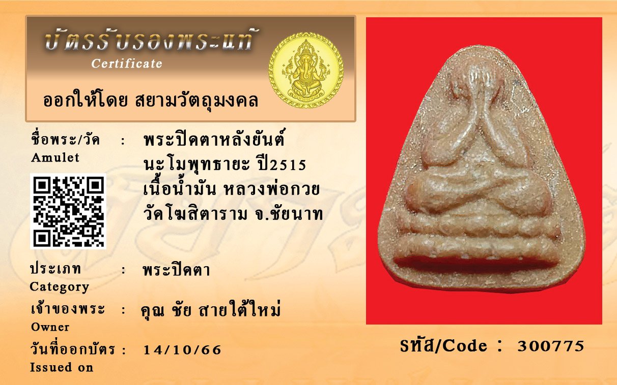 รหัสสินค้า : 300775 พระปิดตาหลังยันต์ นะโมพุทธายะ ปี2515 เนื้อน้ำมัน หลวงพ่อกวย วัดโฆสิตาราม จ.ชัยนาท