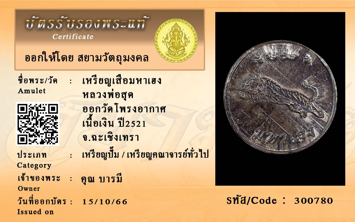 รหัสสินค้า : 300780 เหรียญเสือมหาเฮง หลวงพ่อสุด ออกวัดโพรงอากาศ เนื้อเงิน ปี2521 จ.ฉะเชิงเทรา