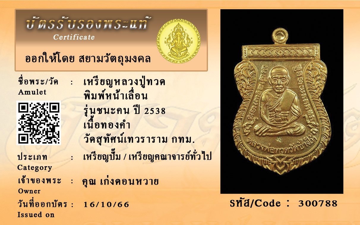 รหัสสินค้า : 300788 เหรียญหลวงปู่ทวด พิมพ์หน้าเลื่อน รุ่นชนะคน ปี 2538 เนื้อทองคำ วัดสุทัศน์เทวราราม กทม.