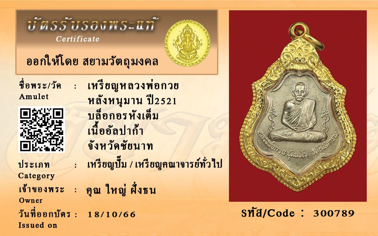 รหัสสินค้า : 300789 เหรียญหลวงพ่อกวย หลังหนุมาน ปี2521 บล็อกอรหังเต็ม เนื้ออัลปาก้า จังหวัดชัยนาท