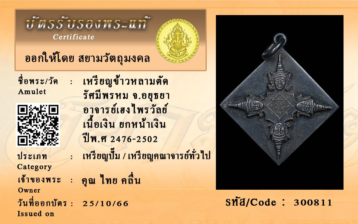 รหัสสินค้า : 300811 เหรียญข้าวหลามตัด รัศมีพรหม จ.อยุธยา อาจารย์เฮงไพรวัลย์ เนื้อเงิน ยกหน้าเงิน ปีพ.ศ 2476-2502