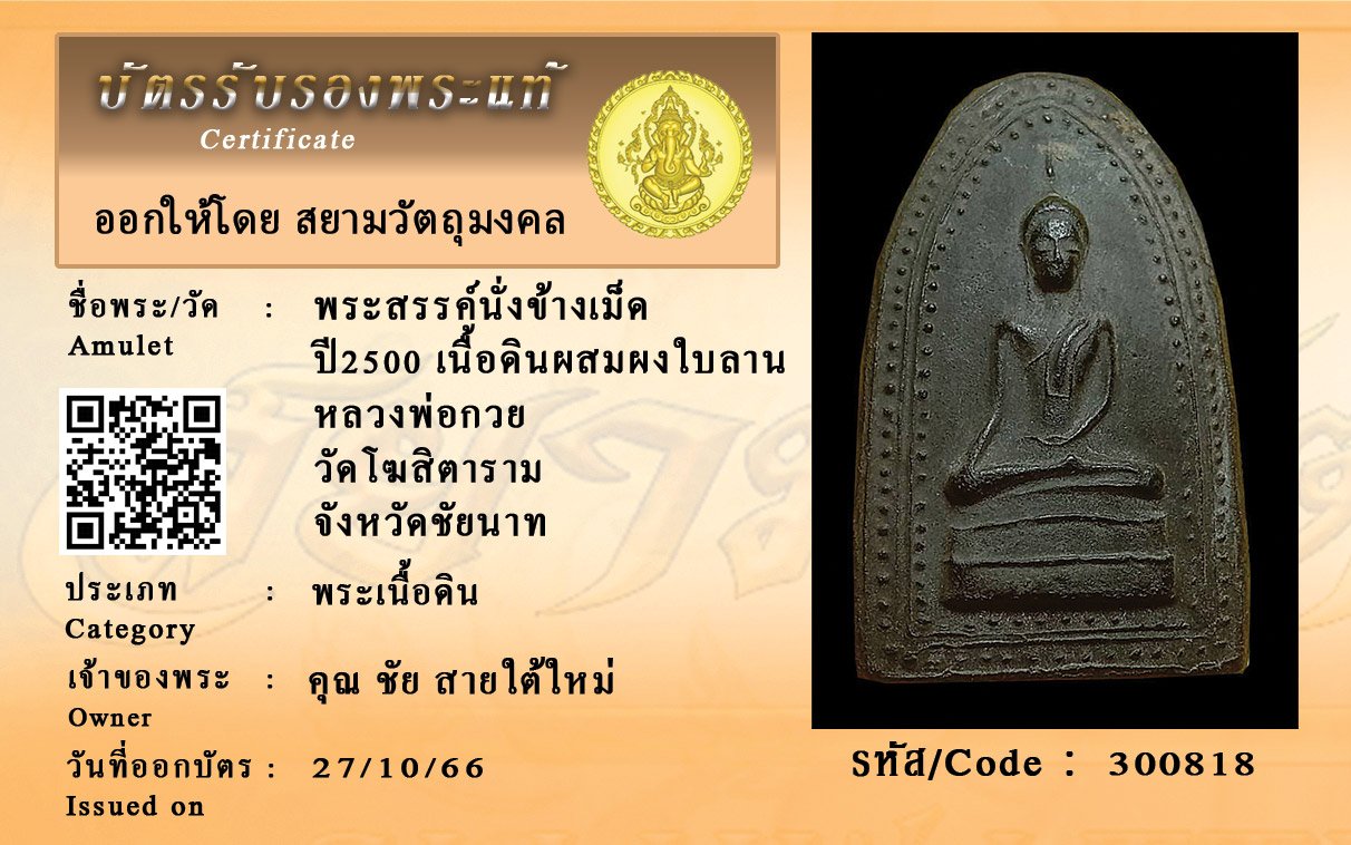 รหัสสินค้า : 300818 พระสรรค์นั่งข้างเม็ด ปี2500 เนื้อดินผสมผงใบลาน หลวงพ่อกวย วัดโฆสิตาราม จังหวัดชัยนาท
