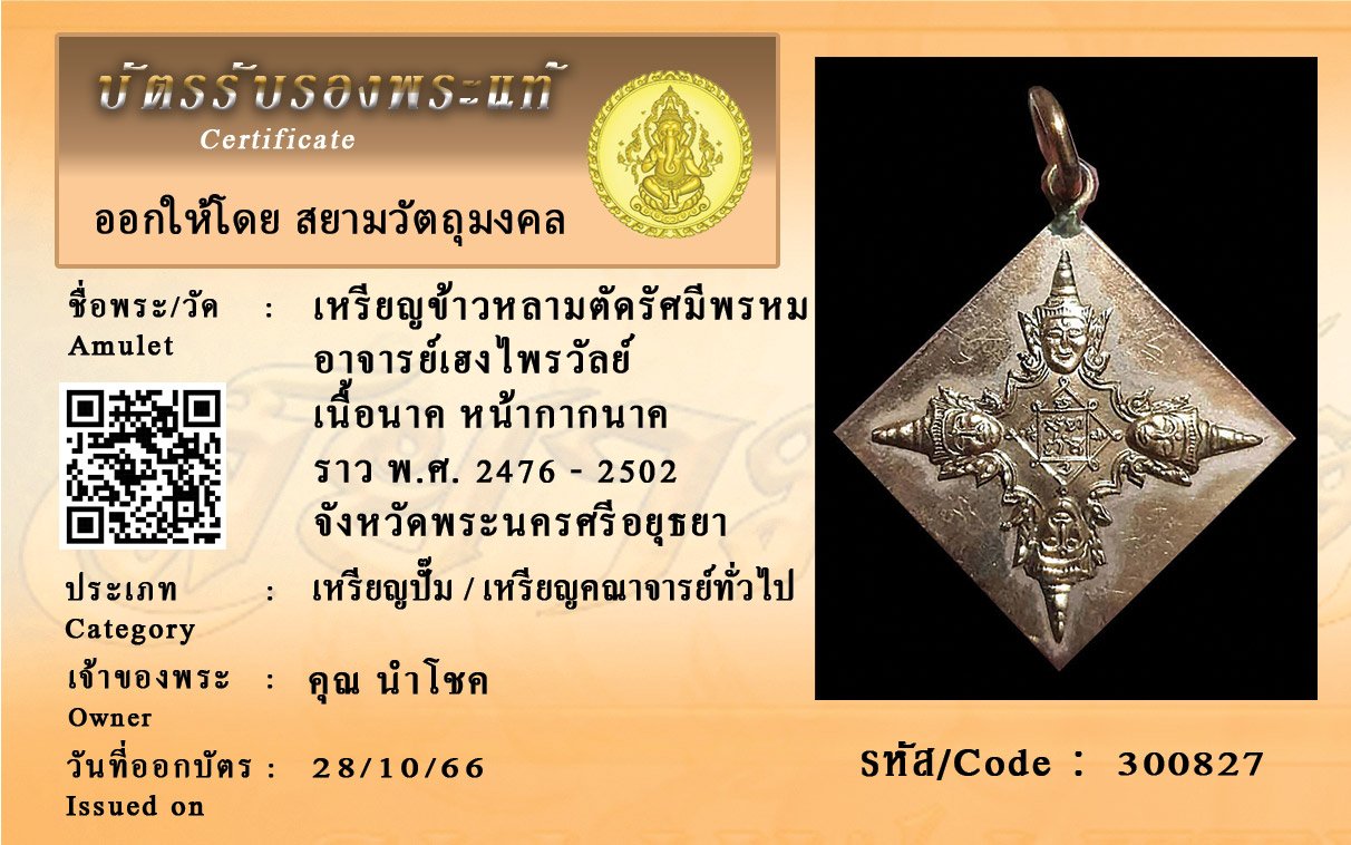 รหัสสินค้า : 300827 เหรียญข้าวหลามตัดรัศมีพรหม อาจารย์เฮงไพรวัลย์ เนื้อนาค หน้ากากนาค ราว พ.ศ. 2476 - 2502 จังหวัดพระนครศรีอยุธยา