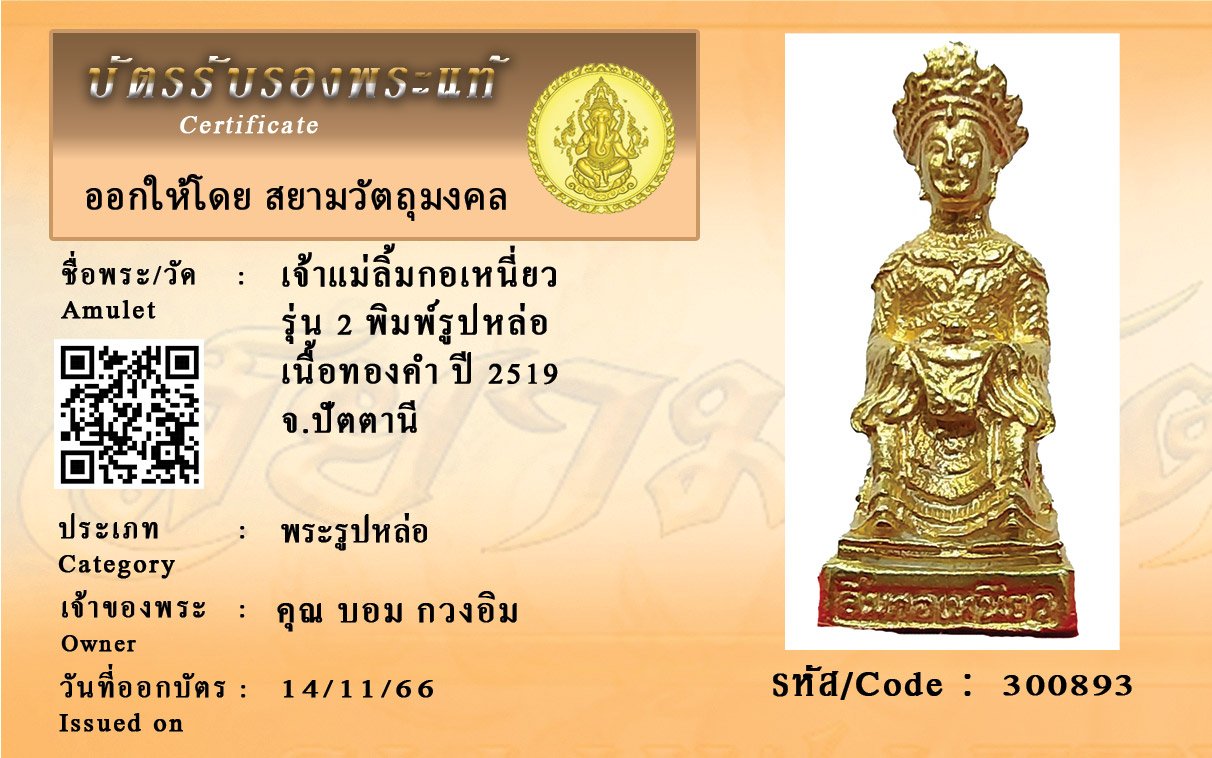 รหัสสินค้า : 300893 เจ้าแม่ลิ้มกอเหนี่ยว รุ่น 2 พิมพ์รูปหล่อ เนื้อทองคำ ปี 2519 จ.ปัตตานี