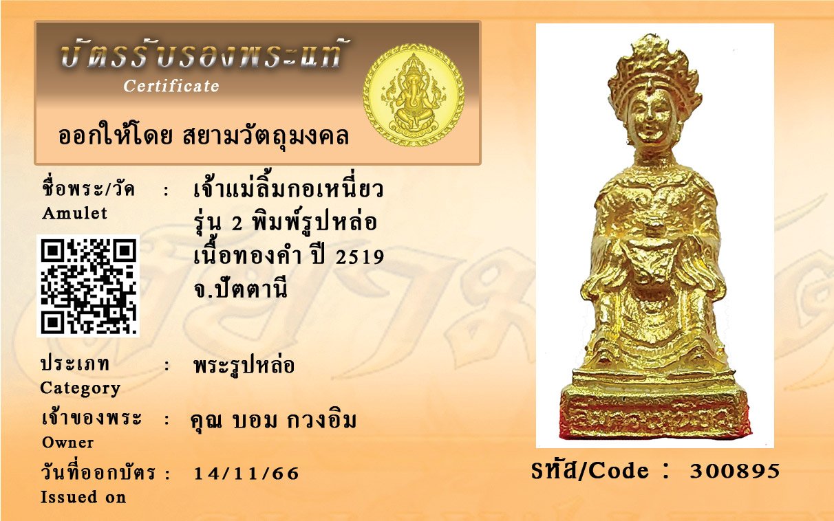 รหัสสินค้า : 300895 เจ้าแม่ลิ้มกอเหนี่ยว รุ่น 2 พิมพ์รูปหล่อ เนื้อทองคำ ปี 2519 จ.ปัตตานี