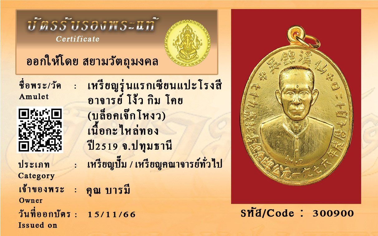 รหัสสินค้า : 300900 เหรียญรุ่นแรกเซียนแปะโรงสี อาจารย์ โง้ว กิม โคย (บล็อคเจ๊กโหงว) เนื้อกะไหล่ทอง ปี2519 จ.ปทุมธานี