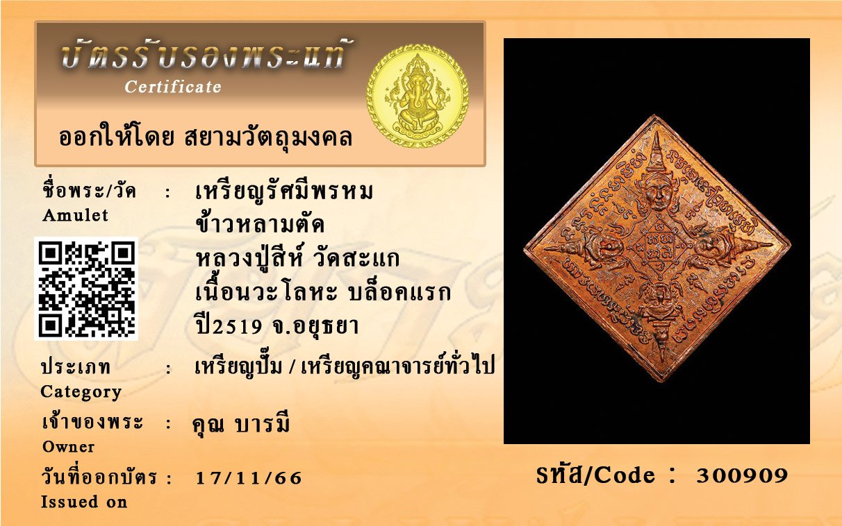 รหัสสินค้า : 300909 เหรียญรัศมีพรหม ข้าวหลามตัด หลวงปู่สีห์ วัดสะแก เนื้อนวะโลหะ บล็อคแรก ปี2519 จ.อยุธยา