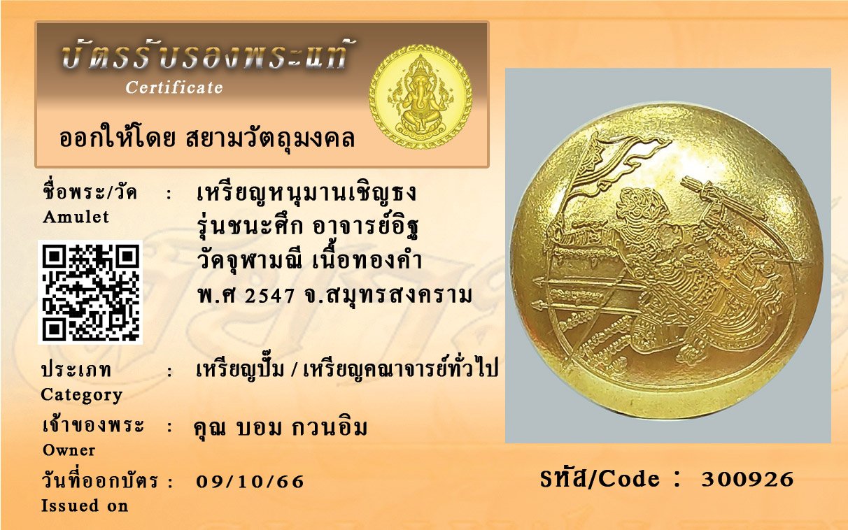 รหัสสินค้า : 300926 เหรียญหนุมานเชิญธง รุ่นชนะศึก อาจารย์อิฐ วัดจุฬามณี เนื้อทองคำ พ.ศ 2547 จ.สมุทรสงคราม