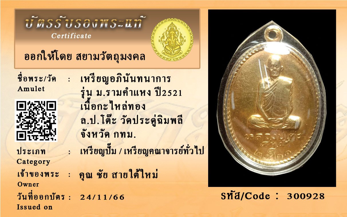 รหัสสินค้า : 300928 เหรียญอภินันทนาการ รุ่น ม.รามคำแหง ปี2521 เนื้อกะไหล่ทอง ล.ป.โต๊ะ วัดประดู่ฉิมพลี จังหวัด กทม.