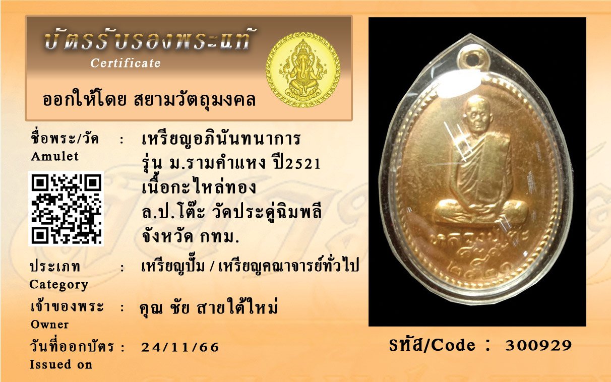 รหัสสินค้า : 300929 เหรียญอถินันทนาการ รุ่น ม.รามคำแหง ปี2521 เนื้อกะไหล่ทอง ล.ป.โต๊ะ วัดประดู่ฉิมพลี จังหวัด กทม.