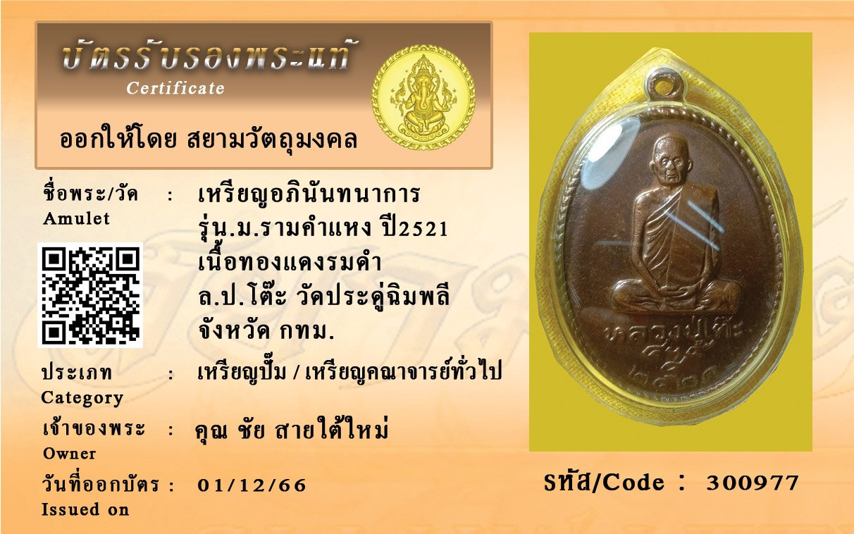 รหัสสินค้า : 300977 เหรียญอภินันทนาการ รุ่น ม.รามคำแหง ปี2521 เนื้อทองแดงรมดำ ล.ป.โต๊ะ วัดประดู่ฉิมพลี จังหวัด กทม.