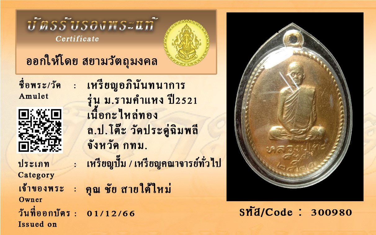รหัสสินค้า : 300980 เหรียญอภินันทนาการ รุ่น ม.รามคำแหง ปี2521 เนื้อกะไหล่ทอง ล.ป.โต๊ะ วัดประดู่ฉิมพลี จังหวัด กทม.