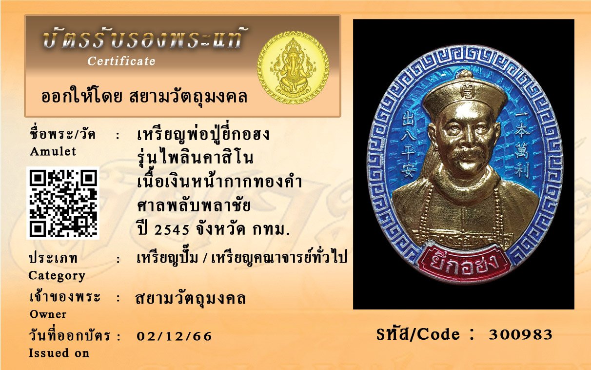 รหัสสินค้า : 300983 เหรียญพ่อปู่ยี่กอฮง รุ่นไพลินคาสิโน เนื้อเงินหน้ากากทองคำ ศาลพลับพลาชัย ปี 2545 จังหวัด กทม.