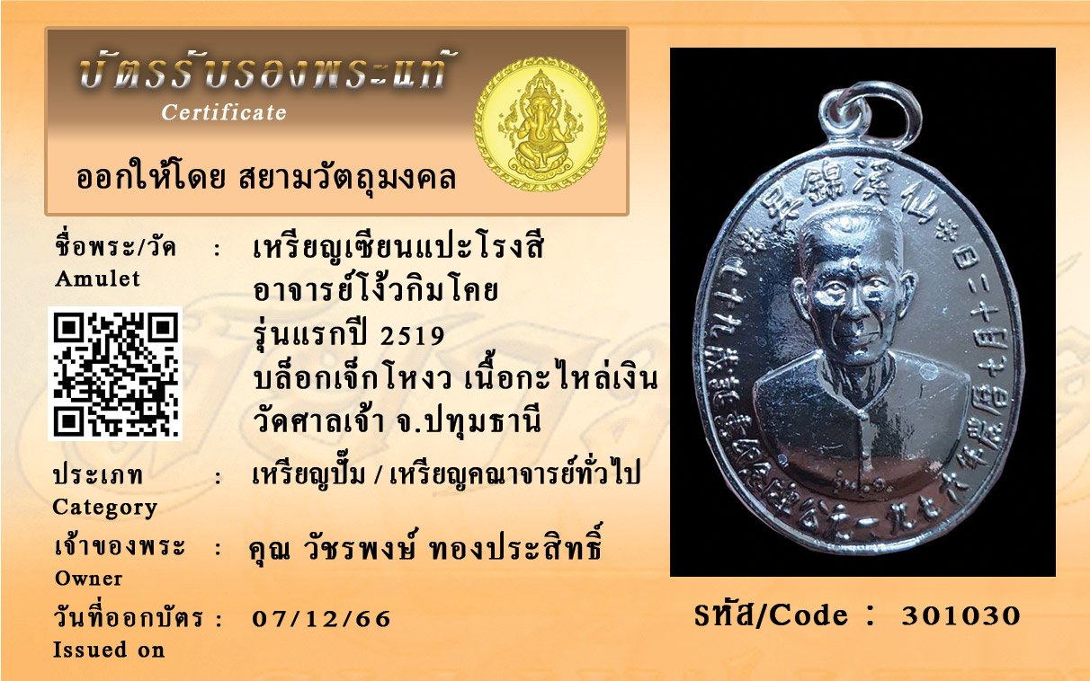 รหัสสินค้า : 301030 เหรียญเซียนแปะโรงสี อาจารย์โง้วกิมโคย รุ่นแรกปี 2519 บล็อกเจ็กโหงว เนื้อกะไหล่เงิน วัดศาลเจ้า จ.ปทุมธานี