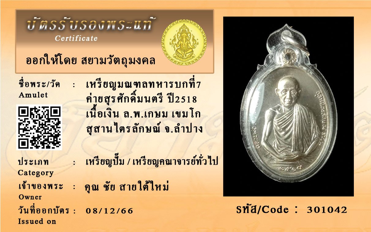 รหัสสินค้า : 301042 เหรียญมณฑลทหารบกที่7 ค่ายสุรศักดิ์มนตรี ปี2518 เนื้อเงิน ล.พ.เกษม เขมโก สุสานไตรลักษณ์ จ.ลำปาง
