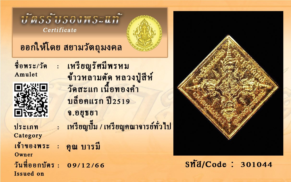 รหัสสินค้า : 301044 เหรียญรัศมีพรหม ข้าวหลามตัด หลวงปู่สีห์ วัดสะแก เนื้อทองคำ บล็อคแรก ปี2519 จ.อยุธยา