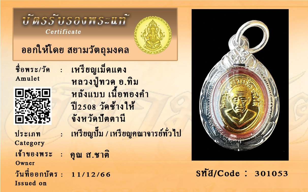 รหัสสินค้า : 301053 เหรียญเม็ดแตง หลวงปู่ทวด อ.ทิม หลังแบบ เนื้อทองคำ ปี2508 วัดช้างให้ จังหวัดปัตตานี