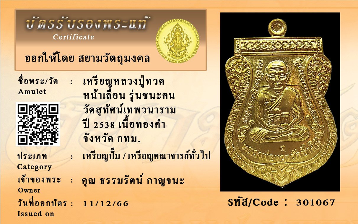 รหัสสินค้า : 301067 เหรียญหลวงปู่ทวด หน้าเลื่อน รุ่นชนะคน วัดสุทัศน์เทพวนาราม ปี 2538 เนื้อทองคำ จังหวัด กทม.