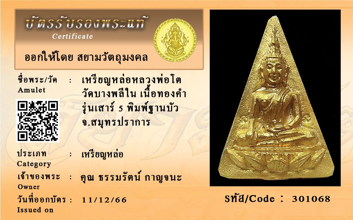 รหัสสินค้า : 301068 เหรียญหล่อหลวงพ่อโต วัดบางพลีใน เนื้อทองคำ รุ่นเสาร์ 5 พิมพ์ฐานบัว จ.สมุทรปราการ