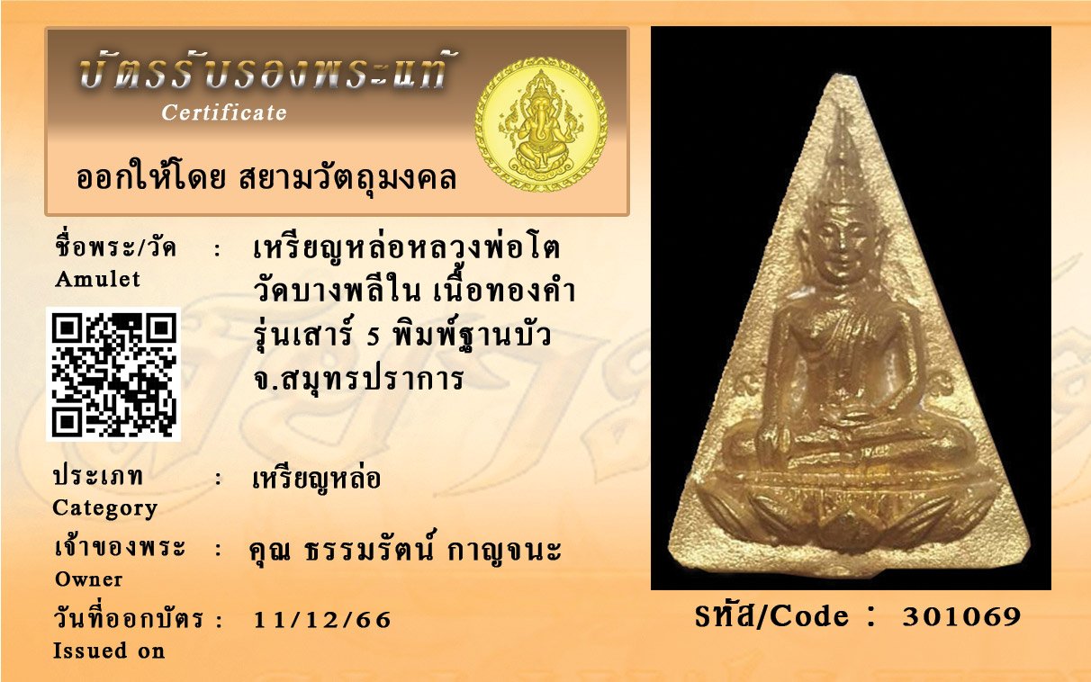 รหัสสินค้า : 301069 เหรียญหล่อหลวงพ่อโต วัดบางพลีใน เนื้อทองคำ รุ่นเสาร์ 5 พิมพ์ฐานบัว จ.สมุทรปราการ