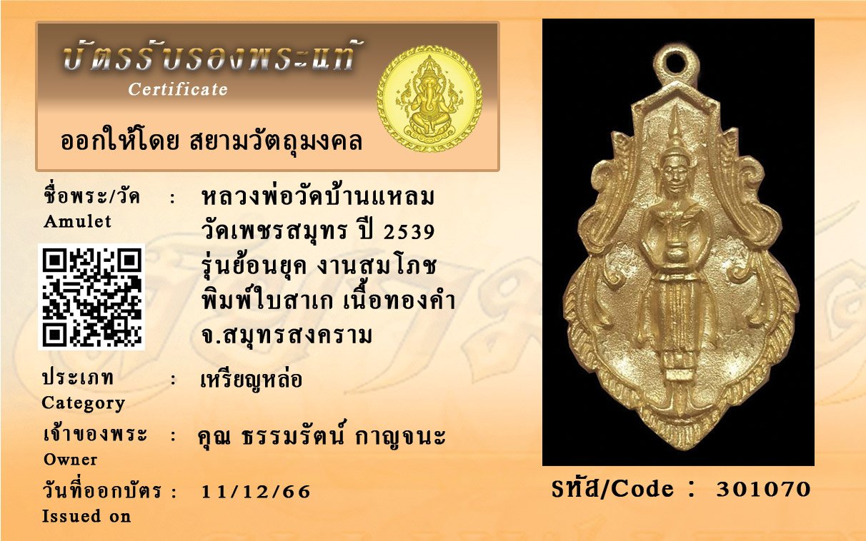 รหัสสินค้า : 301070 หลวงพ่อวัดบ้านแหลม วัดเพชรสมุทร ปี 2539 รุ่นย้อนยุค งานสมโภช พิมพ์ใบสาเก เนื้อทองคำ จ.สมุทรสงคราม