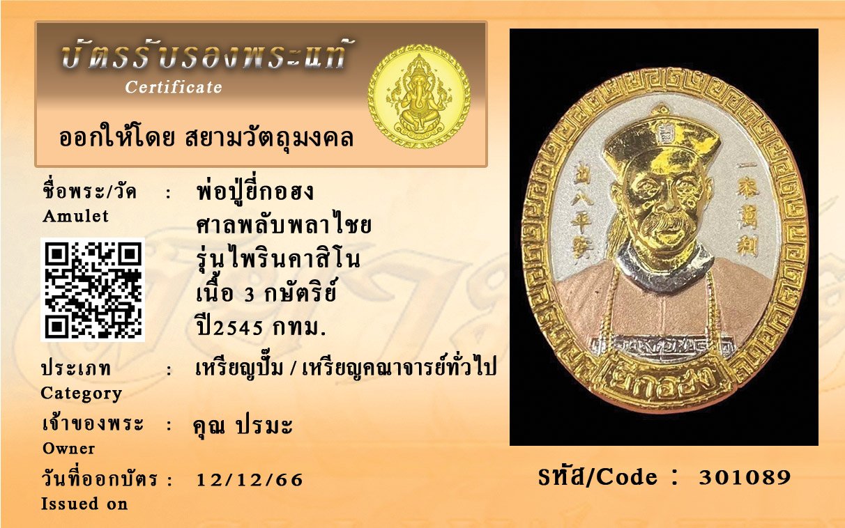 รหัสสินค้า : 301089 พ่อปู่ยี่กอฮง ศาลพลับพลาไชย รุ่นไพรินคาสิโน เนื้อ 3 กษัตริย์ ปี2545 กทม.