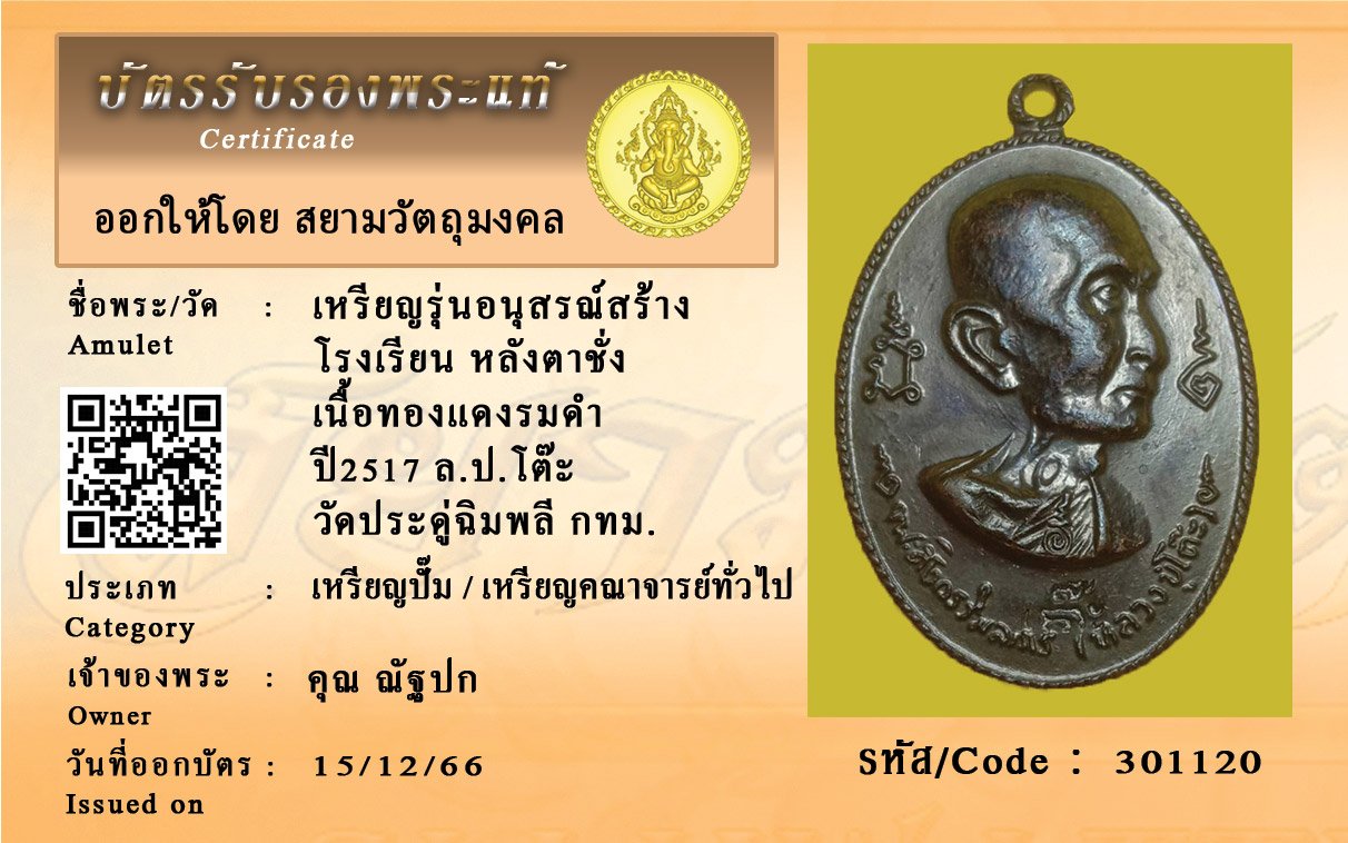 รหัสสินค้า : 301120 เหรียญรุ่นอนุสรณ์สร้าง โรงเรียน หลังตาชั่ง ปี2517 เนื้อทองแดงรมดำ ล.ป.โต๊ะ วัดประดู่ฉิมพลี กทม.