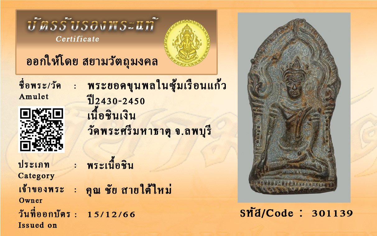 รหัสสินค้า : 301139 พระยอดขุนพลในซุ้มเรือนแก้ว ปี2430-2450 เนื้อชินเงิน วัดพระศรีมหาธาตุ จ.ลพบุรี