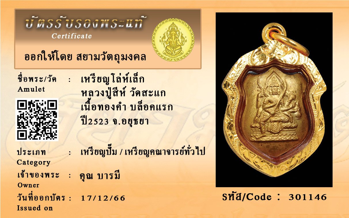 รหัสสินค้า : 301146 เหรียญโล่ห์เล็ก หลวงปู่สีห์ วัดสะแก เนื้อทองคำ บล็อคแรก ปี2523 จ.อยุธยา