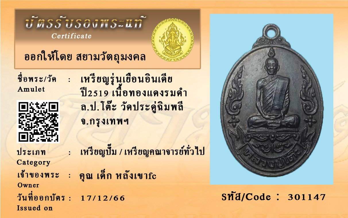 รหัสสินค้า : 301147 เหรียญรุ่นเยือนอินเดีย ปี2519 เนื้อทองแดงรมดำ ล.ป.โต๊ะ วัดประดู่ฉิมพลี จ.กรุงเทพฯ