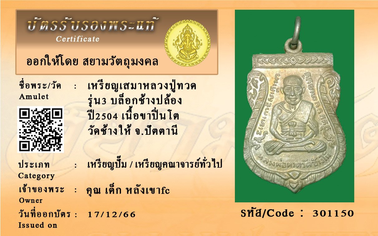 รหัสสินค้า : 301150 เหรียญเสมาหลวงปู่ทวด รุ่น3 บล็อกช้างปล้อง ปี2504 เนื้อขาปิ่นโต วัดช้างให้ จ.ปัตตานี