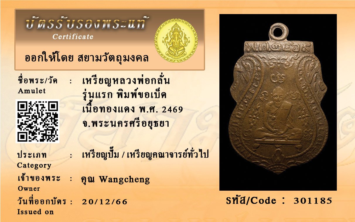 รหัสสินค้า : 301185 เหรียญหลวงพ่อกลั่น รุ่นแรก พิมพ์ขอเบ็ด เนื้อทองแดง พ.ศ. 2469 จ.พระนครศรีอยุธยา