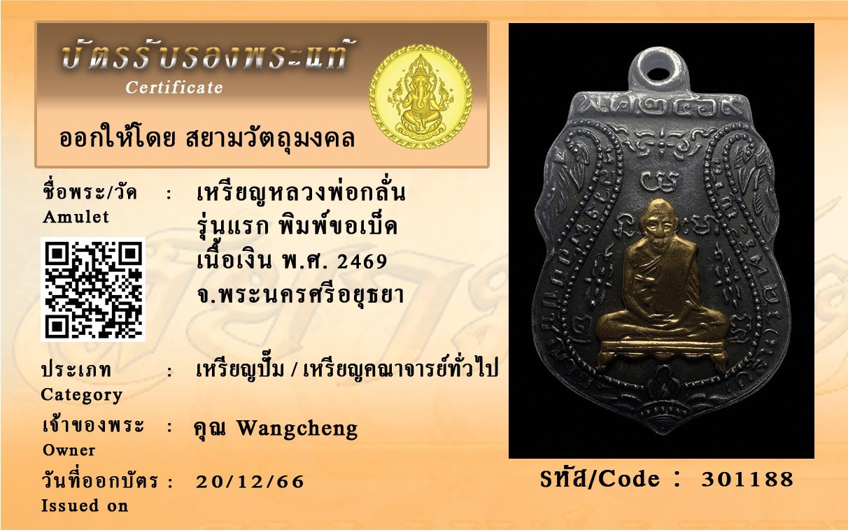 รหัสสินค้า : 301188 เหรียญหลวงพ่อกลั่น รุ่นแรก พิมพ์ขอเบ็ด เนื้อเงิน พ.ศ. 2469 จ.พระนครศรีอยุธยา
