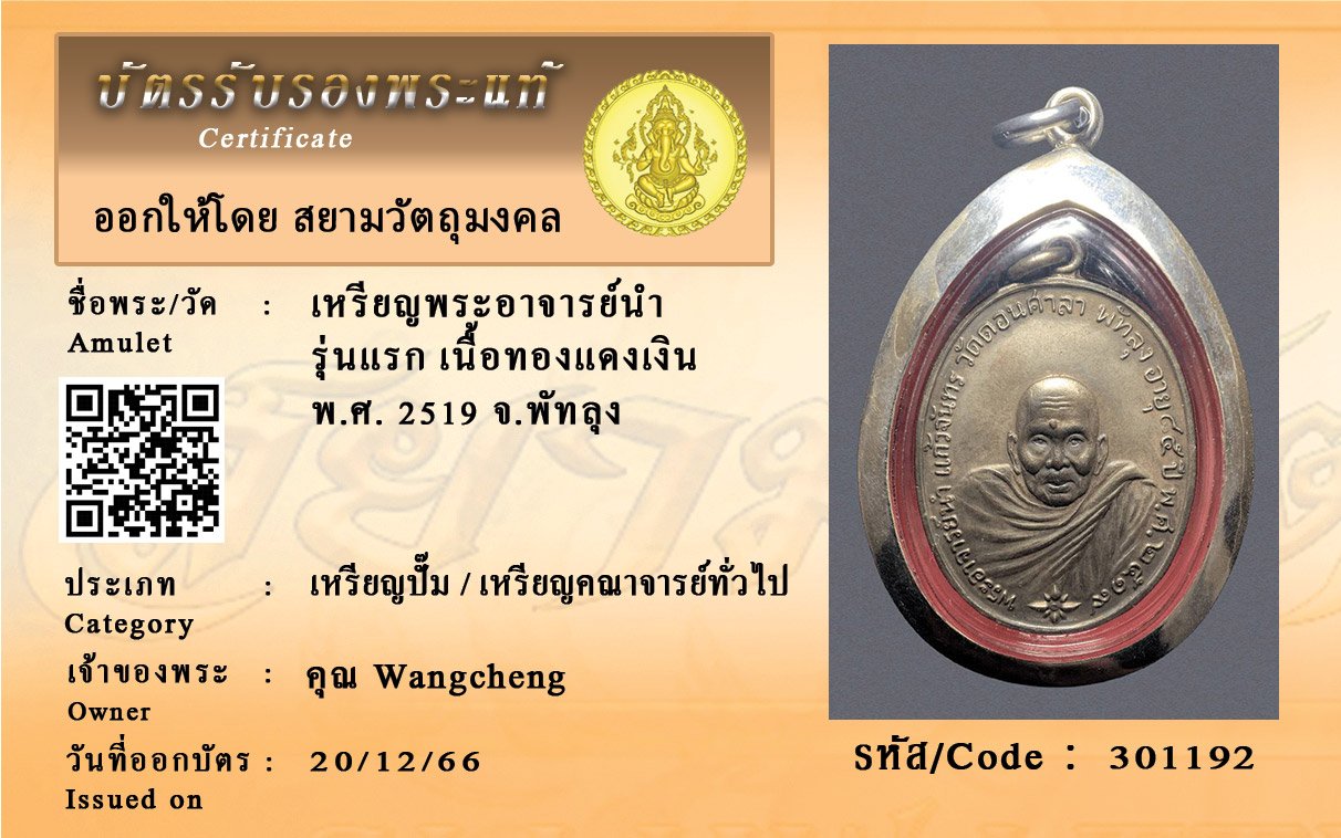 รหัสสินค้า : 301192 เหรียญพระอาจารย์นำ รุ่นแรก เนื้อทองแดงเงิน พ.ศ. 2519 จ.พัทลุง