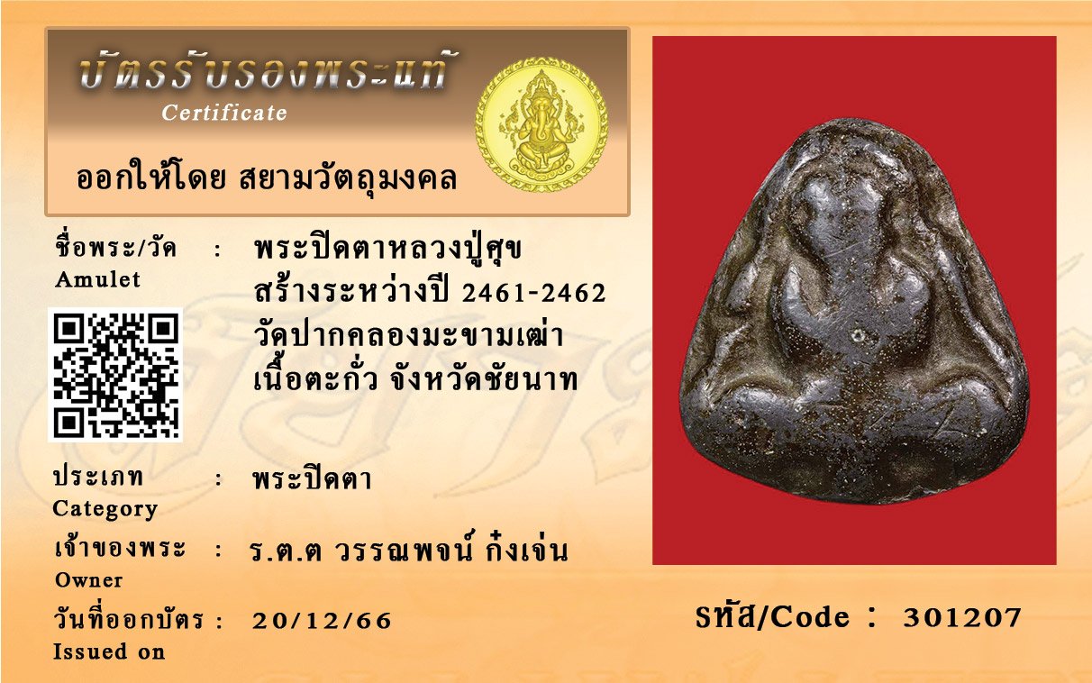 รหัสสินค้า : 301207 พระปิดตาหลวงปู่ศุข สร้างระหว่างปี 2461-2462 วัดปากคลองมะขามเฒ่า เนื้อตะกั่ว จังหวัดชัยนาท