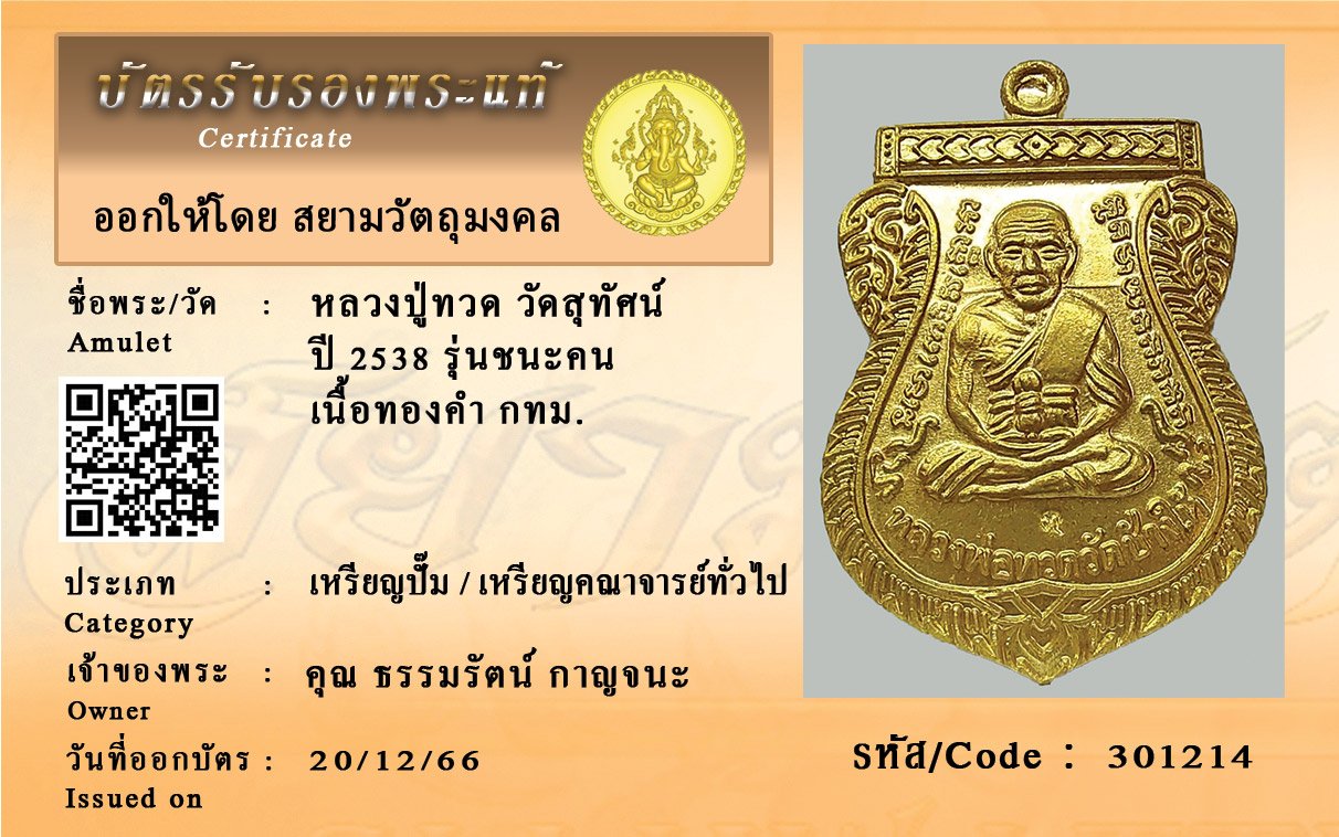 รหัสสินค้า : 301214 หลวงปู่ทวด วัดสุทัศน์ ปี 2538 รุ่นชนะคน เนื้อทองคำ กทม.